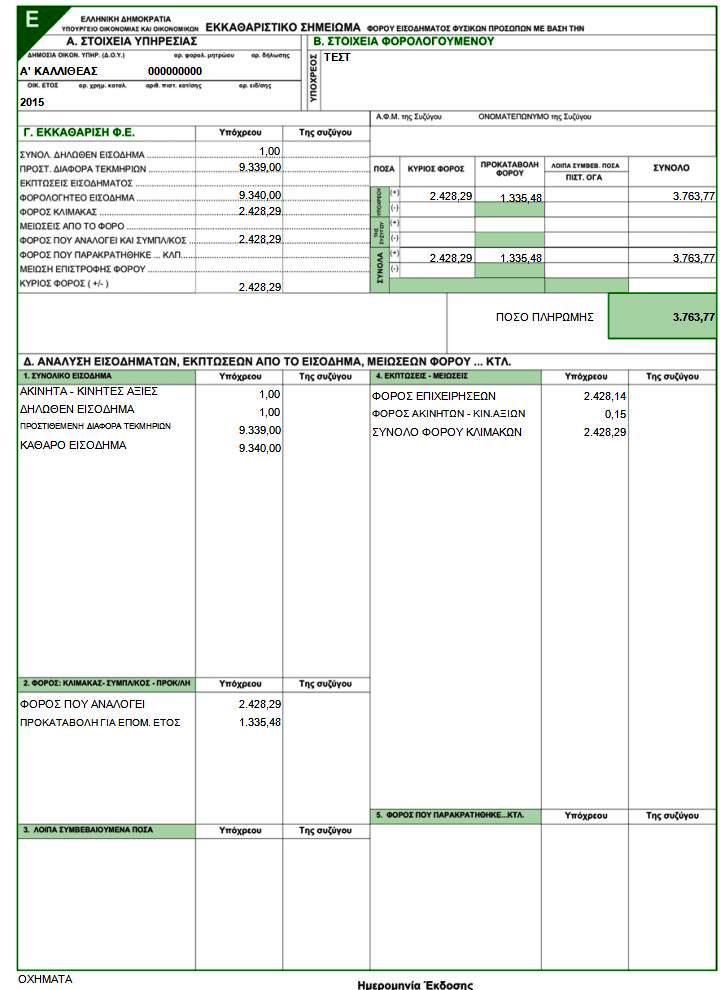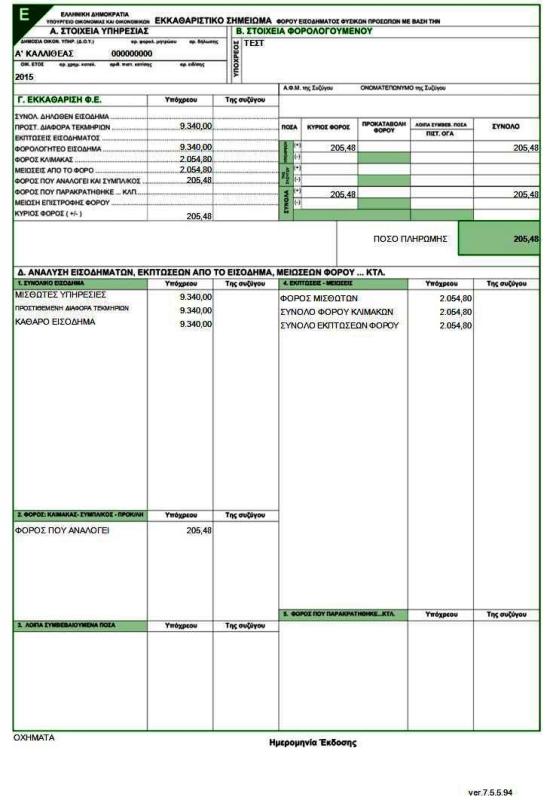 Παρακάτω παραθέτουμε εκκαθαριστικό σημείωμα πολίτη με τις εξής ιδιότητες: Είναι κάτοχος μιας οικίας 75 τ.μ. ενός Ι.Χ. 1400 κ.εκ. είναι πατέρας δυο ανήλικων παιδιών και είναι άνεργος με κυριολεκτικά μηδενικό εισόδημα. Με αυτό το σενάριο προκύπτει φόρος 205,48 ευρώ.